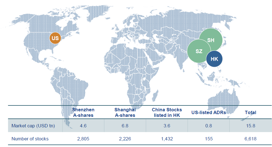 China A shares represent companies listed on the Chinese mainland (on the Shanghai and Shenzhen exchanges). It is a relatively new market and until recently has been closed to foreign buyers. It is a broadly diversified index of over 5,000 companies with a combined market cap of over U$10 trillion, making it the second largest market in the world (behind the United States). It is the biggest stock market many people have never heard of.