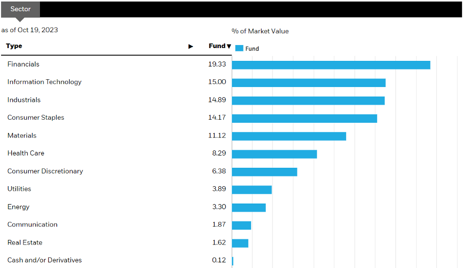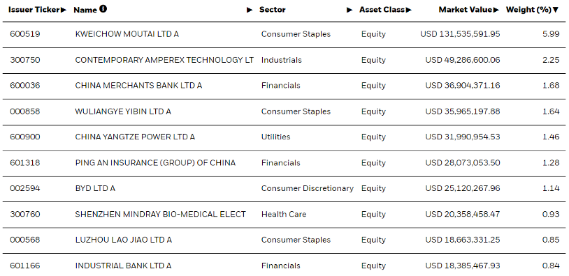 This ETF is sizeable with assets exceeding U$2 billion. Its Total Expense Ratio (TER) stands at just 0.4%, approximately half the cost of an equivalent actively managed fund. It owns 557 stocks so represents a broad market opportunity and it is well-diversified across both sectors (see chart below) and individual stocks. The largest holding is white liquor manufacturer Kweichow Moutai with a 5% position size, while most other stocks have weights of less than 2%