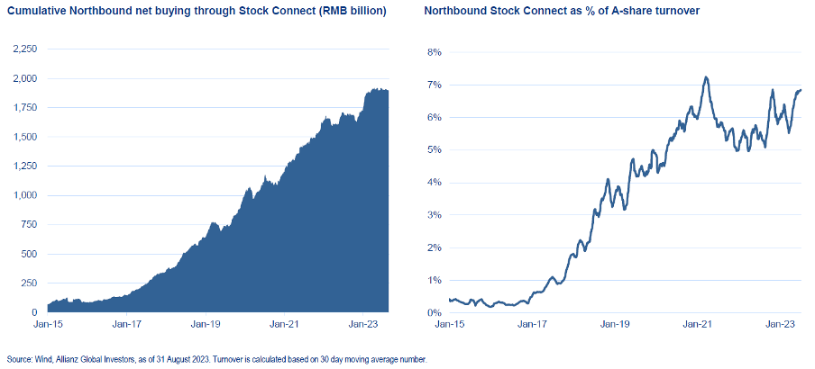 Foreign investors have been actively participating in mainland stock markets through the Stock Connect program. Northbound flows in this context refer to overseas investors, including those from Hong Kong and abroad, trading eligible China A shares. The chart on the left shows the rising cumulative trade volume since the program’s launch in 2014. Furthermore, as illustrated in the right-hand chart, Stock Connect flows have been steadily increasing as a percentage of total China A-share turnover.