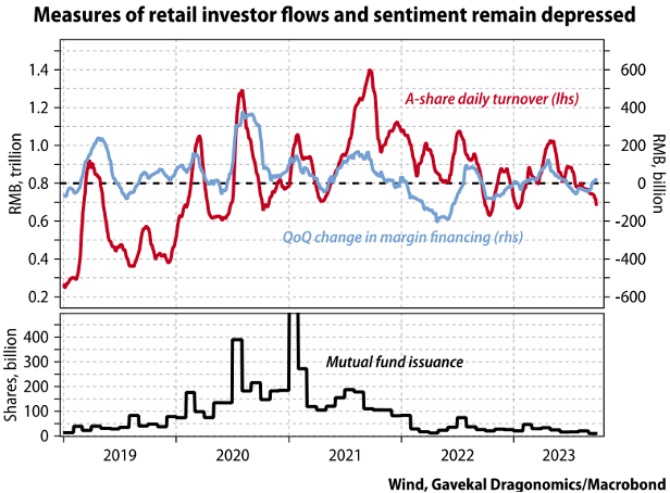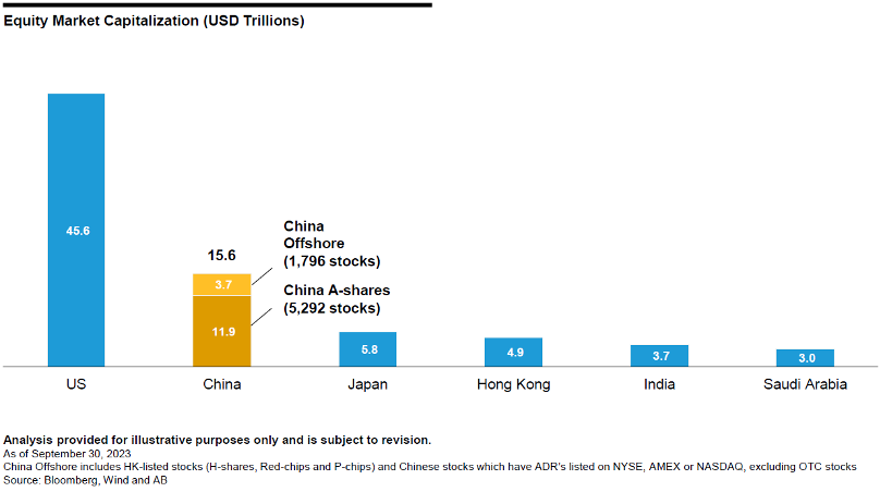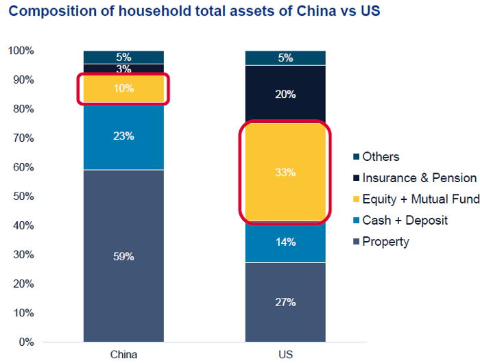 Chinese households also have significant room to add to equities as the population ages and becomes wealthier. Equities represent just 10% of household assets, compared to 33% in the US.