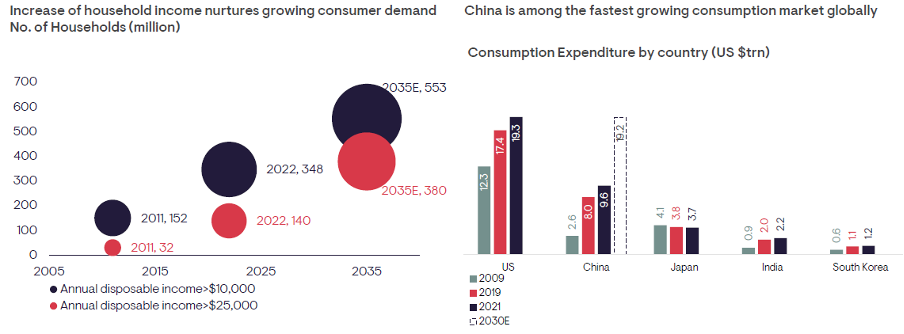 Looking at the bigger picture, the Chinese consumer market is poised to double in size over the next decade, driven by the prospect of 380 million households reaching a U$25,000 income level by the year 2035. This should magnify the positive “flow” effect into Chinese equities over the coming years.