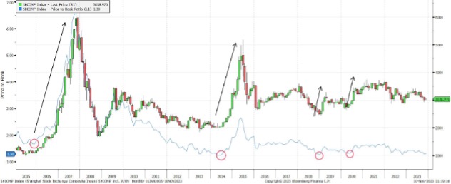 The price/book multiple is one of our favoured ratios for judging the valuation of Chinese A shares because, historically, it has helped us to identify important turning points. Simply put, when the P/B ratio falls to 1.5x or lower (red circles below), it tends to infer high returns over the next few years.