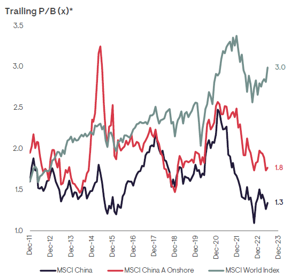 Comparing the China A price/book ratio to the broader MSCI World index can also be a useful exercise. A lower multiple versus its peers reflects an additional valuation cushion for China A shares (and vice versa).