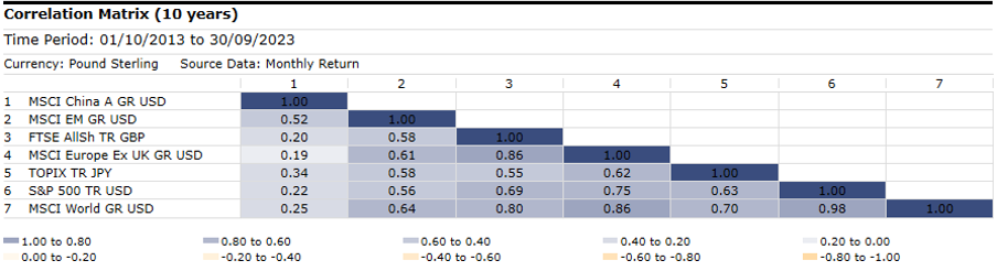 As demonstrated in Column 1 of the table below, China A shares have displayed a very low correlation with the likes of US, UK, European and Japanese equities over the past decade. Notably, the correlation with the MSCI World stands at just 0.25.