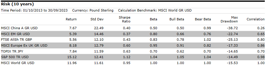 From a returns perspective, the MSCI China A index has delivered superior returns over the past decade compared to a broad Emerging Markets index. It has also outperformed some developed markets, such as the FTSE UK All Share (see table below). While its performance has been in line with European and Japanese indices, it has (like most regional indices) lagged behind the exceptionally strong U.S. stock market.
