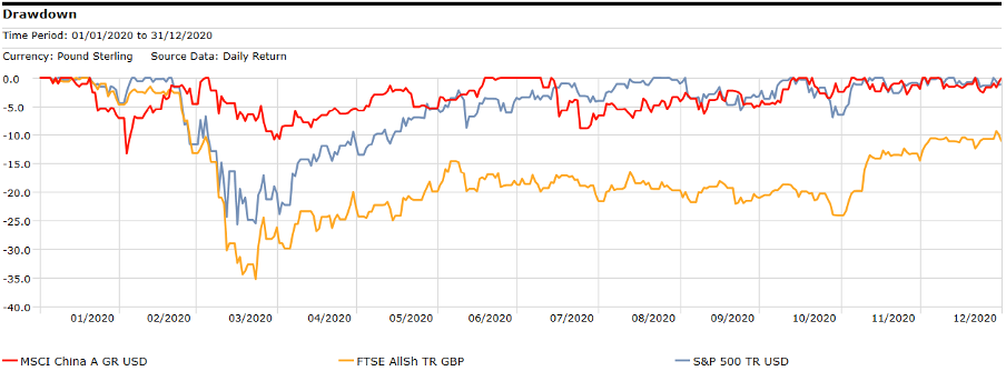 Another perspective on the diversification benefits of owning China A shares is to consider their drawdown profile, which quantifies the downside risk during market declines. An illustrative example of this occurred during the Covid-19 lockdown period in 2020 when global equity markets faced a significant downturn. China A shares (indicated by the red line in the chart below) demonstrated remarkable resilience and were amongst the best-performing regional markets. This outcome can be attributed to differing Covid-19 policies and policy responses. Notably, China A shares experienced significantly smaller drawdowns compared to UK stocks (orange) and even the US market (blue).