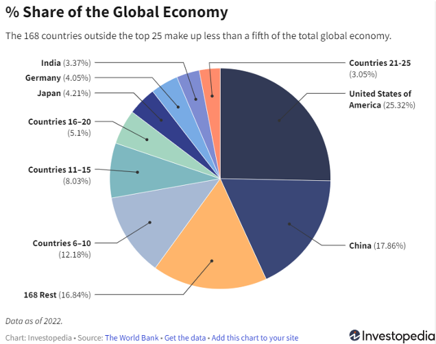 China’s presence in capital market benchmarks is limited. While the country accounts for a substantial 18% of the global GDP, as illustrated in the pie chart below, it comprises a mere 3% of the MSCI AC World equity index. Even a modest increase in this market share could result in significant share price gains.