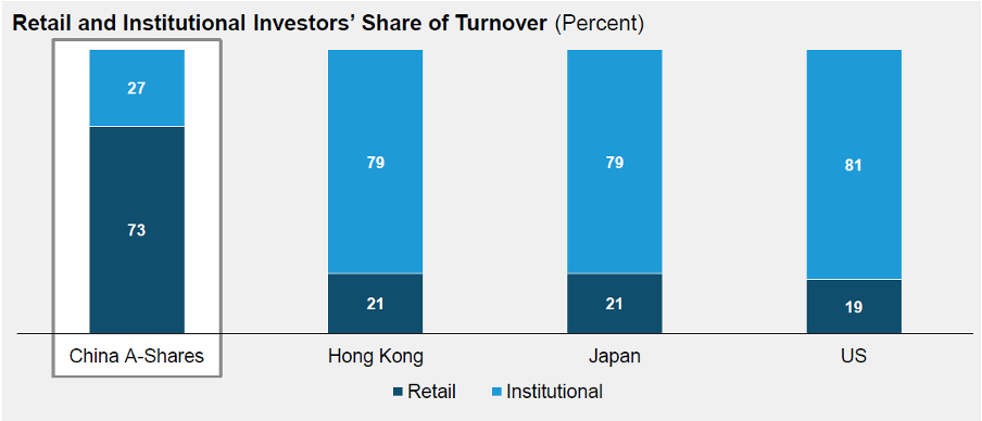 Unlike many other developed world stock markets, the China A shares market is still dominated by retail investors, which leaves it prone to wilder swings on the up and downside. However, institutional investor ownership has scope to expand meaningfully over the coming years.