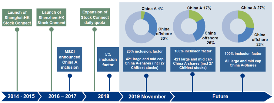 “In 2019, MSCI increased the inclusion ratio of China A shares from 5% to 20% in the MSCI Emerging Markets Index. Investors globally are now increasingly re-evaluating the appropriate allocation framework of their equity portfolios. China’s growing economic strength and improving market accessibility may transform the characteristics of the emerging-market asset class and its role in global portfolios.” (source: MSCI.com)