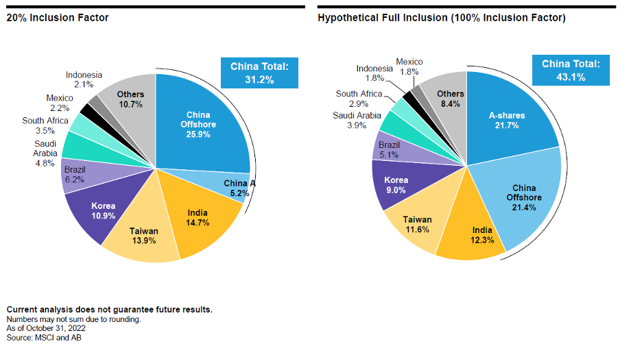 A hypothetical full inclusion factor at 100% would see China A shares grow to over 20% of the MSCI Emerging Markets index compared to today’s 5% weight, as the pie chart below demonstrates.