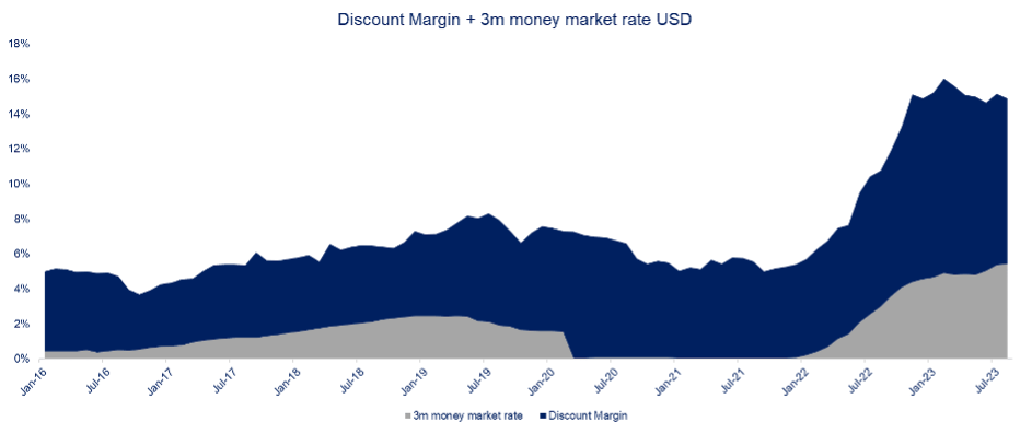 First, as Cat bonds feature a floating-rate coupon, yields have automatically increased in tandem with rising interest rates. Second, widening spreads have become notable, primarily due to a supply-demand imbalance following the occurrence of Hurricane Ian. It’s worth noting that the Cat bond market can experience periods of “hard” and “soft” market conditions, with high losses leading to higher spreads (a hard market) and vice versa (a soft market). The accompanying graph illustrates this trend, with the grey line representing the cash rate and the blue line depicting the spread.