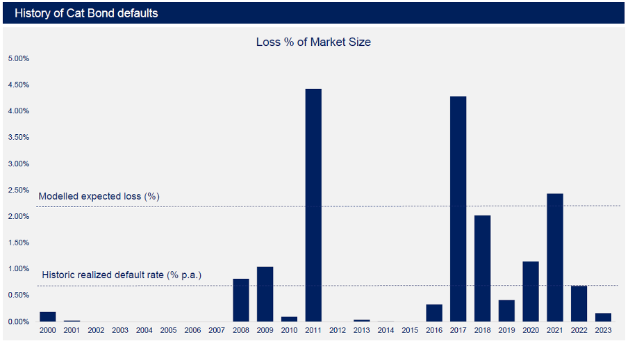 In recent years, Cat bonds have only experienced losses when the insurance and reinsurance industry as a whole has faced exceptionally high insured losses, typically in the range of U$50 billion to U$70 billion. This highlights how Cat bonds can absorb a high degree of catastrophic events without necessarily triggering losses for the bondholder.