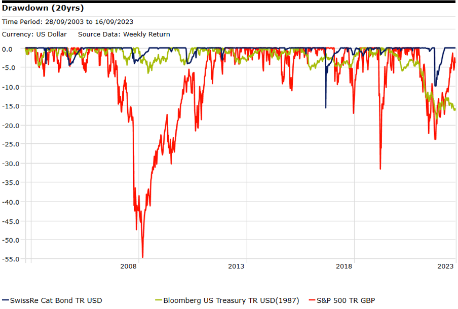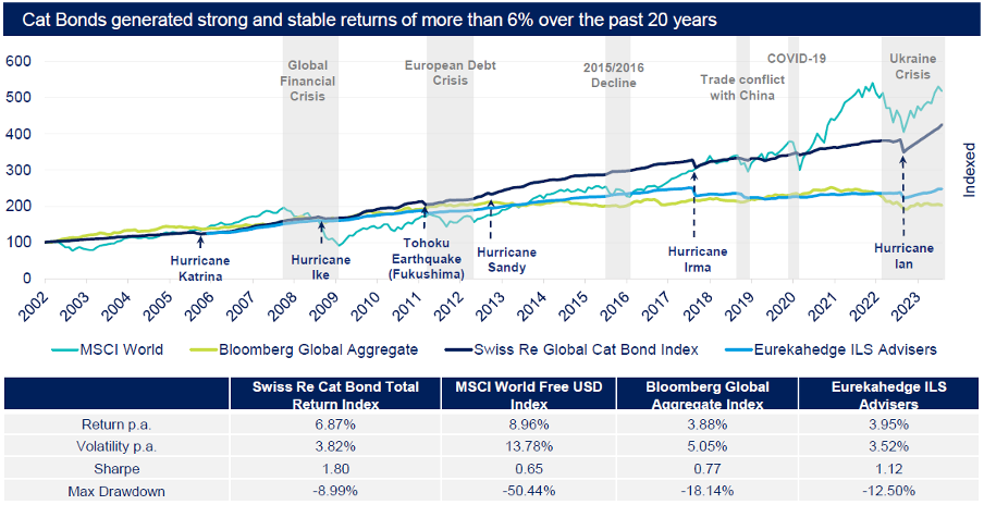 Over the past 20 years, Cat bonds have delivered an annualised return in excess of 6% p.a. with lower volatility and drawdowns than equity or bond markets. The chart below shows the performance of the Swiss Re Cat Bond index (since its 2002 inception until August 2023) and encompasses various market events and natural catastrophes.