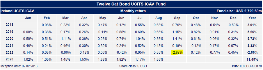 Because of this, many Cat bond funds outperform the index in a drawdown. The table below shows the performance of the Twelve Cat Bond fund over the past five years since inception in USD. In September 2022 the fund lost -2.87% (highlighted in yellow) due to hurricane Ian. This compares favourably to the immediate drawdown of -10% using weekly index data.
