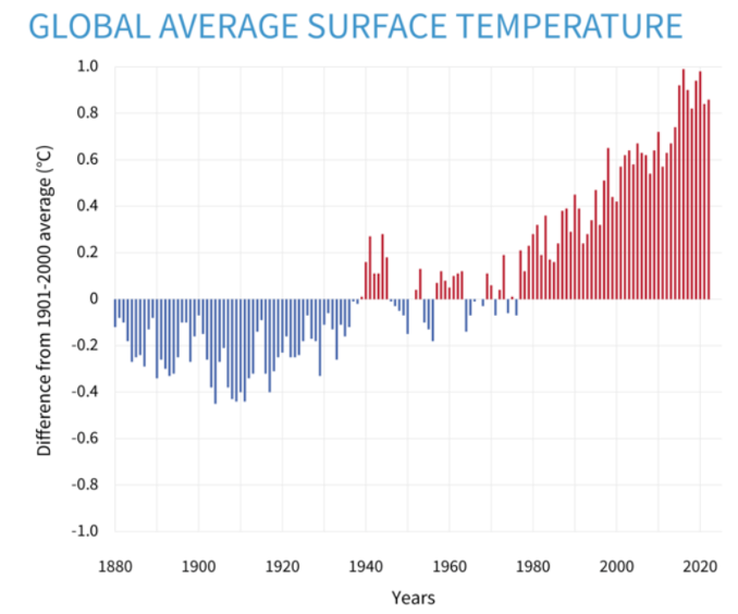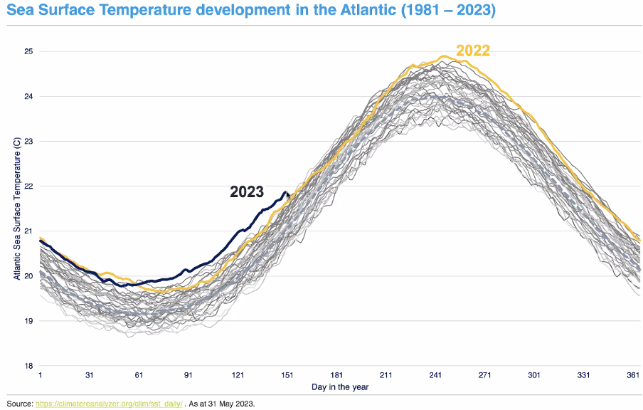 The chart below (source: NCEI) shows the yearly surface temperature of the globe compared to the 20th century average and highlights that the ten warmest years on record have all occurred since 2010. Indeed, June 2023 was the hottest month on Earth since records began in 1850.
