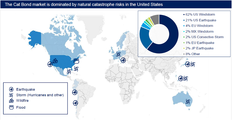 Cat bonds play a significant role in underwriting four primary categories of catastrophic risk: Wind, Earthquake, Wildfire and Flood. Among these categories, US hurricane risk (centred mainly around the state of Florida) represents a substantial portion of the market due to the frequency and severity of hurricanes in the region.