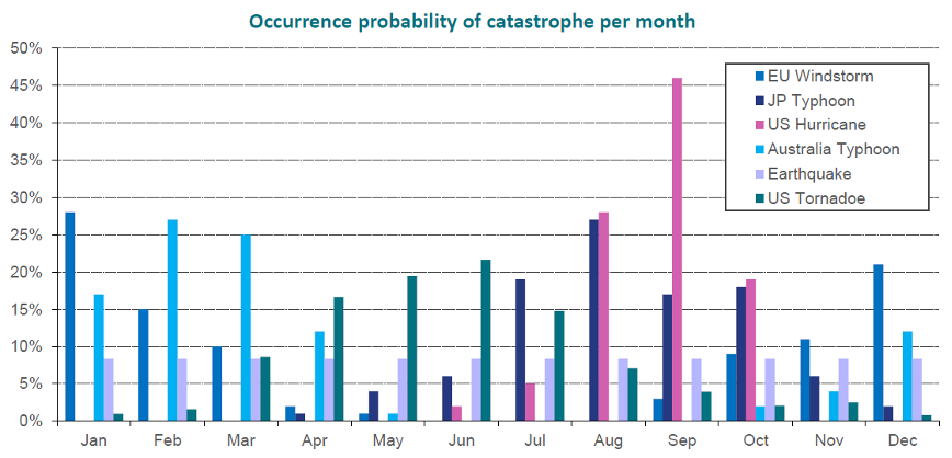 There tends to be a high degree of seasonality in Cat bond losses with most typically occurring between August and October due to the timing of the US hurricane season (see pink bars in the chart below). European windstorm losses typically occur in the December-January period. There is no seasonality observed in earthquake losses.