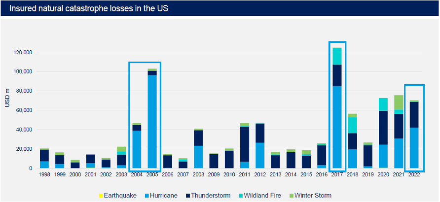 Ultimately, weather events are unpredictable and insured losses can vary significantly from year to year. The largest US catastrophe losses were in 2017, due to the three large Atlantic hurricanes (Harvey, Irma and Maria). 2005 is also highlighted in the chart below, which reflects the widespread devastation caused by hurricane Katrina. More recently, hurricane Ian led to significant insured losses (and volatility in the Cat bond market) in 2022.