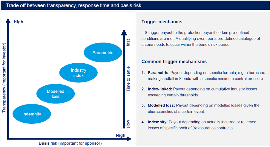 Cat bonds feature pre-defined trigger parameters that determine when and how much should be paid to the sponsor in the event of a catastrophe. There are four main types of triggers: