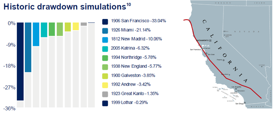 Cat bonds remain a relatively young asset class so actual historical drawdowns represent only a fraction of the potential weather-related risks. A credible worst-case scenario involves a major earthquake striking California. Such an event could lead to substantial insured losses, and it’s possible that these losses would be correlated with a decline in equity markets, given the significant exposure of tech companies in Silicon Valley.