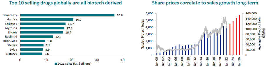 In 2021, all of the top 10 bestselling drugs by revenues were biologics, developed by Biotech companies. The production and replication of biologics are known to be intricate and costly processes. However, if we were to encapsulate the Biotech theme into a single chart, this one (below right) effectively illustrates the positive correlation between the increasing revenues from biotech drugs and the corresponding rise in share prices.