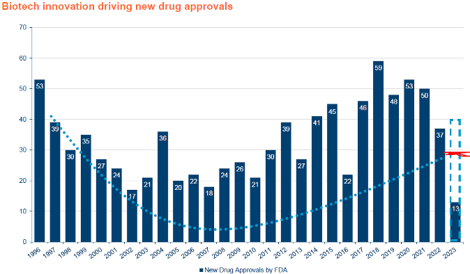 The approval of biologics in the United States is overseen by the Food and Drug Administration (FDA) and it typically comes with a period of sales exclusivity and protection from cheaper generic competition. Critically, the trend in drug approvals remains favourable.