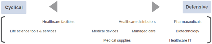 Each sub-sector has a unique sensitivity to the business cycle, which allows active investors to tactically evolve their Healthcare exposure depending on underlying economic trends. The sales and earnings of medical tech and equipment businesses are often highly cyclical, so they tend to produce better returns during economic upswings.