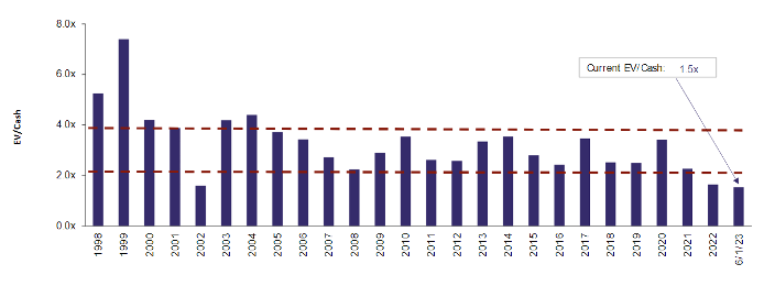 EV is a comprehensive measure of a company’s total value, which combines its market capitalisation and total debts, but excludes the amount of cash it has on hand. A low EV/cash ratio is generally interpreted as an indicator of cheapness and an attractive entry point for investors.
