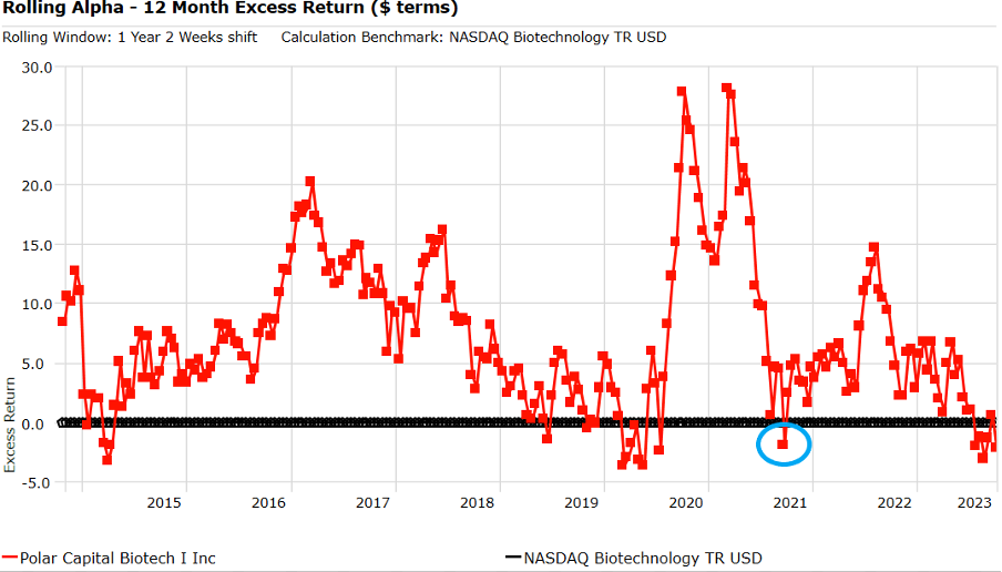 We first invested in the Polar Biotech fund at the end of July 2021 (marked by the blue circle on the chart below), after an abrupt period of underperformance left the fund’s rolling 12 month return below that of the benchmark. The rarity of this underperformance gave us confidence that the manager would soon return to form and produce a (much) better return than the benchmark.